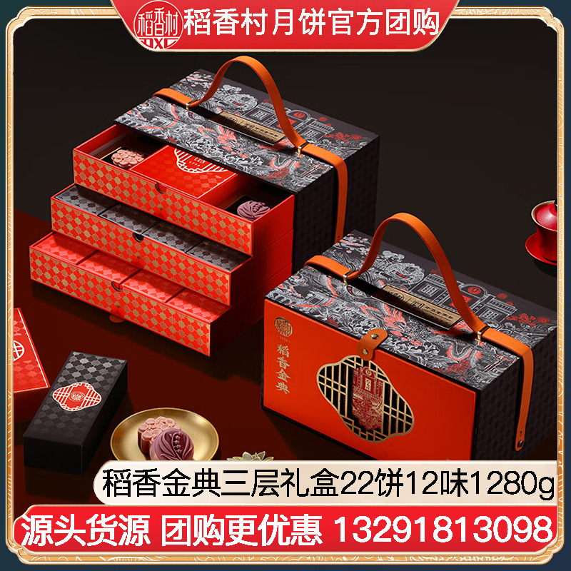 368稻香村稻香金典月饼礼盒1280g广式蛋黄莲蓉月饼苏式月饼港式流心奶黄月饼礼盒苏州稻香村月饼官方团购【稻香金典手提三层礼盒】22饼12味1280g