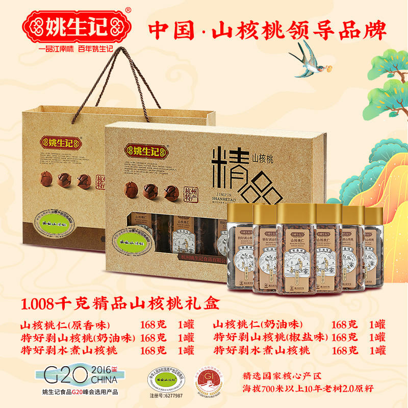 姚生记官网提供姚生记山核桃,姚生记坚果,姚生记礼盒,姚生记大礼包,姚生记年货礼盒,姚生记官方团购定制服务,官方授权,团购批发13291813098,18668138105。姚生记精品山核桃礼盒1008g纯临安山核桃礼盒。