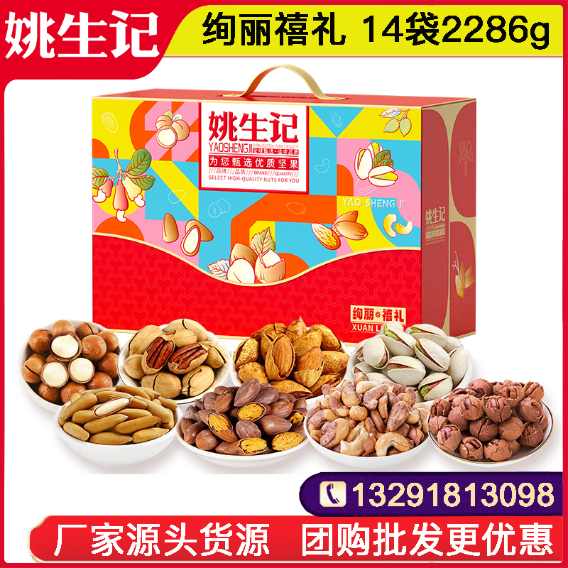姚生记官网提供姚生记山核桃,姚生记坚果,姚生记礼盒,姚生记大礼包,姚生记年货礼盒,姚生记官方团购定制服务,官方授权,团购批发13291813098,18668138105。姚生记绚丽禧礼坚果礼盒14袋2286g坚果零食大礼包